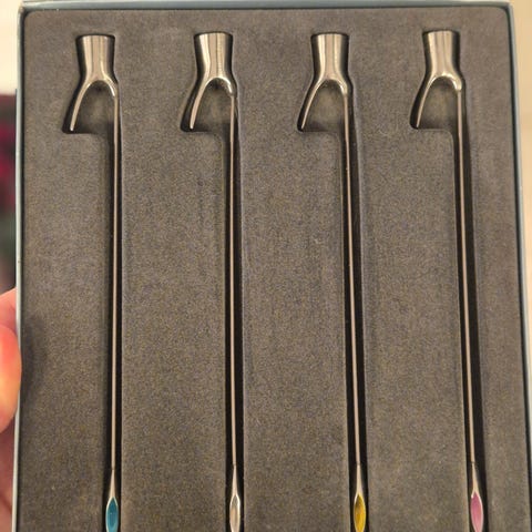 Er guld ikke din julefarve. Så er her noge lysshowet fra Georg Jensen Christmas Norditalien designet af Maria Berntsen. De er i rustfrit stål og forneden er der et lille farvet felt. Der er 4 i kassen. De er knap 21 cm lange, og har aldrig været brugt. Pris kr 165