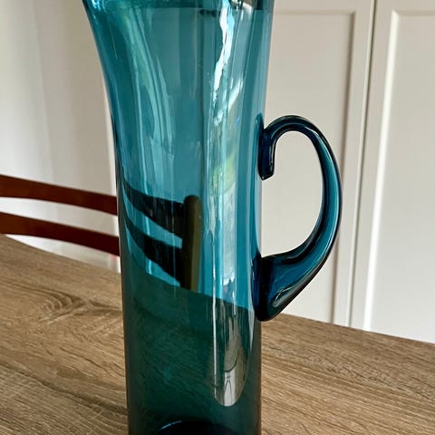 Den fineste flødekande i turkis og klart glas fra serien Harlekiini, af Nanny Still for Riihimäen Lasi, Finland, 1959