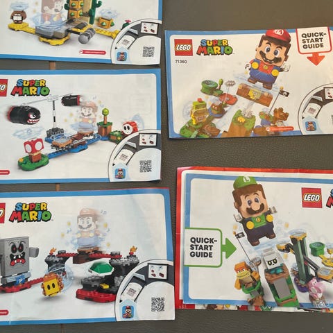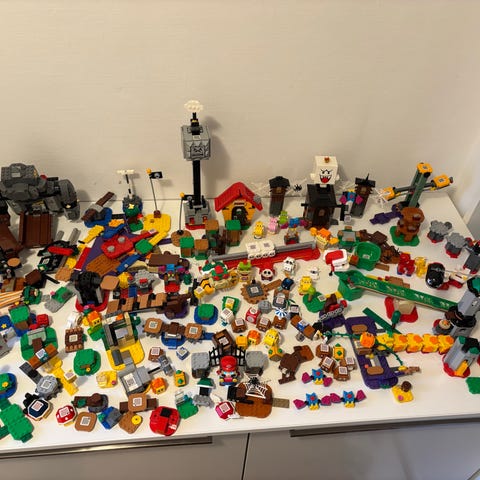LEGO Super Mario legetøjssæt med forskellige moduler og figurer, herunder et skib, et slot, svampehuse og diverse baner. Sættet består af farverige byggeelementer designet til at skabe interaktive og kreative spiloplevelser.