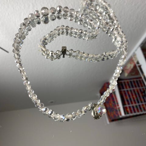 Sød halskæde sølvfarvede perler. turkis og koralrør små kugler.