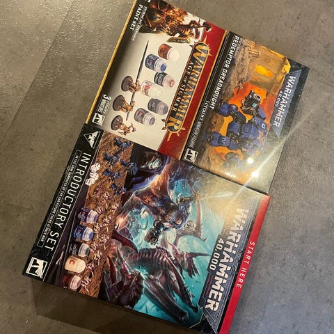 Games Workshop Warhammer 40.000 miniaturebyggesæt inklusive miniaturedele, værktøj som pincet og tang, lim, terninger, baser, og en rekrutteringsmanual. Nogle er figurere er blevet limet og malet lid men ellers er det godt. Maling er ikke med i sættet
