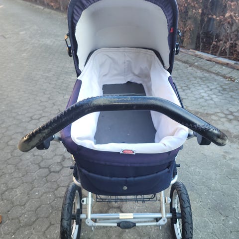 Odder barnevogn i sort farve med fire store hjul. Barnevognen har en rummelig liggedel med kaleche, der beskytter mod vejr og vind. Stellet er lavet af metal, og vognen har en praktisk opbevaringskurv under sædet. Designet til at give komfort og stabilitet under brug.