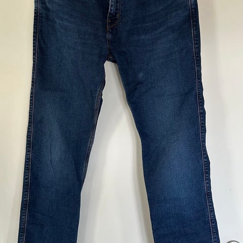 Forvaskede jeans som er brugt, men ellers i fin stand. Ingen huller eller lign. Størrelse 34/32. Farven er lys blå. Materiale: Bomuld og lidt elastan. Bukserne er super behagelige med lidt strech i stoffet.
