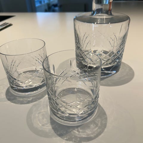 Helt nyt karaffel sæt - tilhørende 4 glas og stander