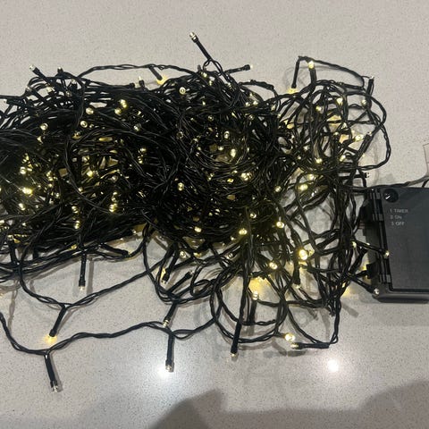 Jul LED-lyskæde med batteridrevet strømforsyning. Lyskæden er designet til julebrug og indeholder små LED-pærer monteret på en sort ledning.