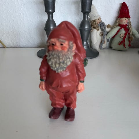 Torslow nisse som kan sidde på en hylde, da han sidder med bøjede ben.
