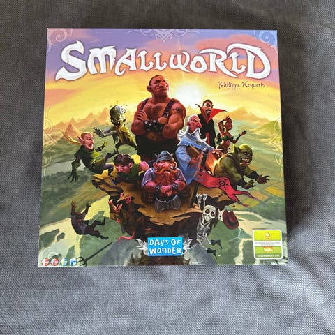 Days of Wonder Small World brætspil med spillebrikker, kort, terning og spilleplader. Spillet indeholder forskellige racer og evner til strategisk spil. Materialer inkluderer pap og plastikkomponenter. Velegnet til flere spillere og familiespil.