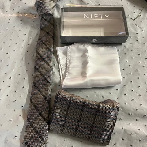 Cube Butterfly slipsæt til mænd bestående af butterfly og lommetørklæde med stribet mønster i blå og orange farver. Brugt 1 gang til konfirmation