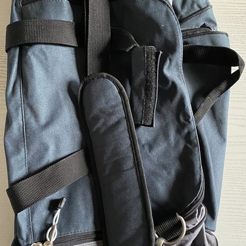 Foret taske i stærkt vandskyende stof, solide brune hanke. Stort rummeligt rum, med indvendig lynlåslomme på siden. På forsiden to gode lommer, den ene med lynlås den anden med velcro. Lommerne er ca. 13-14 cm brede og 15 cm dybe. Lynlåslomme på bagsiden ca. 15 bred og 13 cm dyb. Mønstret taske i klare farver på brun bund. Mrk.: St.Sulpice Bredde ca. 42-52 cm, højde ca. 32 cm.