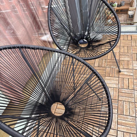 Sæt bestående af to stole med stel i aluminium og flettet sæde. Stolene vejer næsten ingenting og kan stables.