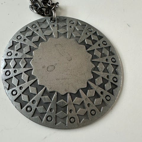 Halssmykke af tin fra 1960’erne med viking symboler. Vedhænget måler 6 x 4cm, kæden 70cm.