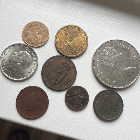 Samling af danske mønter med samme motiver og forskellige årstal, inklusive portrætter og rigsvåben. Mønterne er af metal og sælges som et samlet lot, og kan sendes mod betaling f porto, eller femtes her på midtfyn efter aftale...