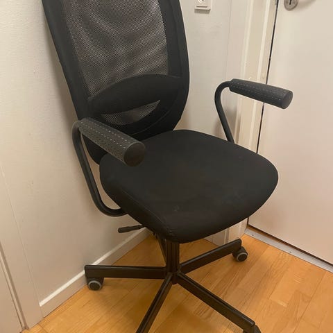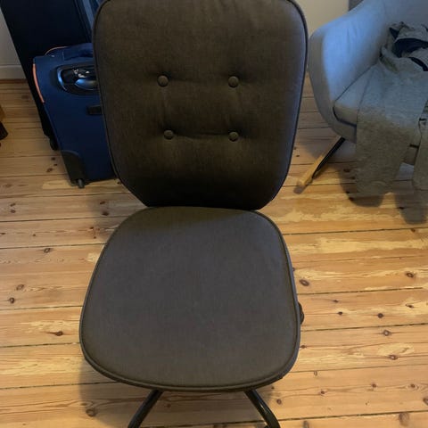 IKEA kontorstol med rød sæde- og rygplade i plastmateriale. Sort stel med fem hjul for mobilitet. Justerbar højde og ergonomisk design til brug ved skrivebord. Utrolig kompakt stol med et unikt udseende. Fin stand.
