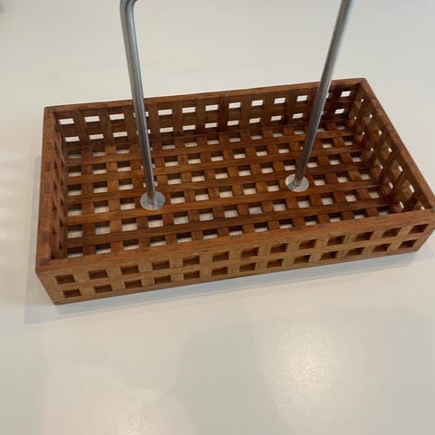 Dette er originalt en avis holder i teaktræ fra Trip Trap, der er blevet lavet om til to firkantede radankulært teaktræs riste.