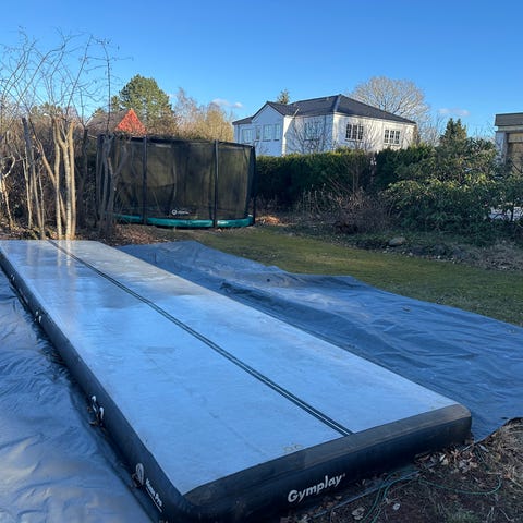 Airtrack fra Gymplay købt i 2020 for 4500 kr. Brugt 2 gange. H15cm x B150cm x L400cm. Den originale taske og elektriske pumpe medfølger. Prisen er fast.