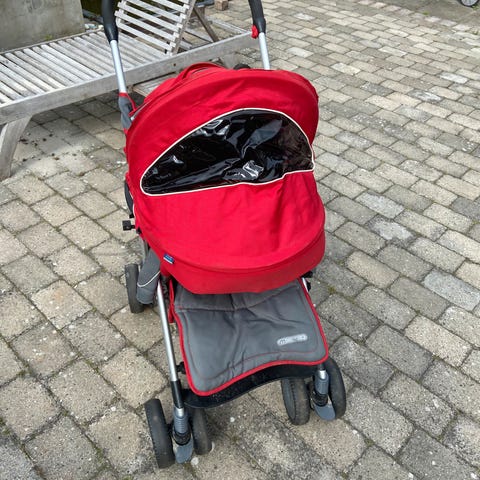 Let at folde sammen og ideel til rejser. Kun brugt til ét barn. Maks. belastning 15 kg. Regnslag medfølger. Kan hentes i Hedensted.