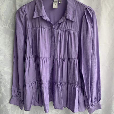 Cremefarvet bluse / skjorte med mørkeblå prikker. 3/4 lange ærmer.
