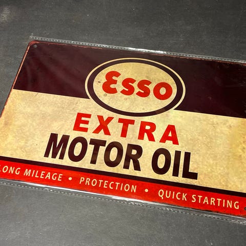Texaco Motor Oil metal skilt med klassisk logo og tekst. Skiltet er rektangulært og har en rød, sort og hvid farvepalet.