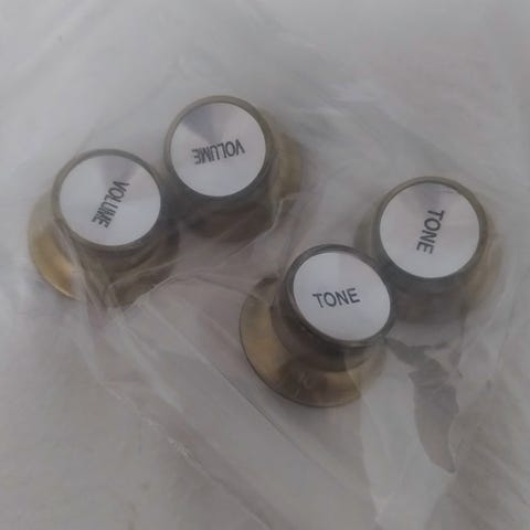 Jeg sælger er helt nyt sæt knapper fra Harley Benton til Stratocaster. De er i aged White, det inkludere 1x Volume, 2x Tone, 1x Swtich.