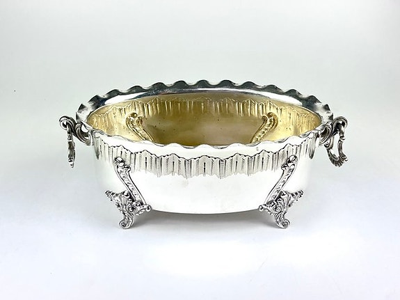 Et meget smukt og elegant sidebord. Bordet består af to runde glasplader med tre ben imellem. Benene ser ud til at være lavet af fineret træ (med en slags valnøddefiner), men de kunne også være lavet af plastik. Benene er fastgjort til de to plader med kobberforbindelser. Glasset er tykt, slebet glas. Det er 1 cm tykt (!).