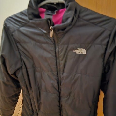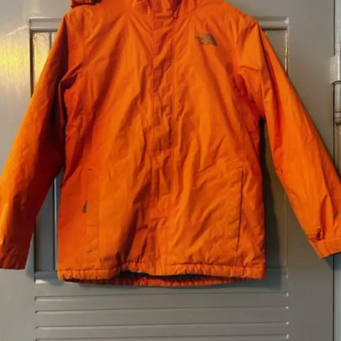 The North Face drengejakke i størrelse 10-12 år, farven grå. Jakken har en quiltet struktur med lynlåslukning og to lynlåslommer foran. Den er designet til børn og egnet til udendørs brug.
