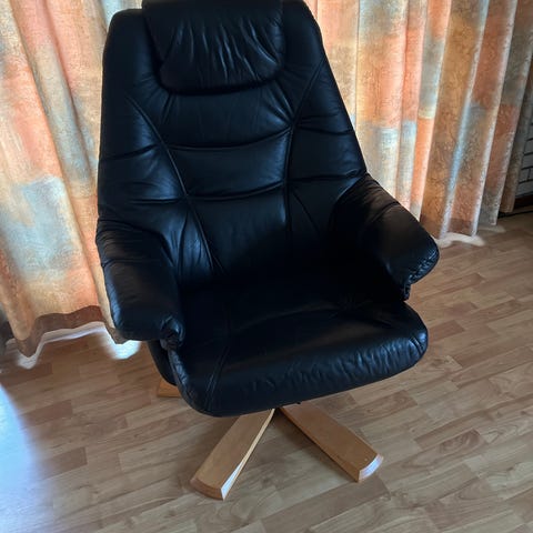 Denne her har et lidt mere klassisk design med tykke armlæn, højt ryglæn og blød siddehynde, også i sort læder (eller læderlook). Den står på en drejefod.