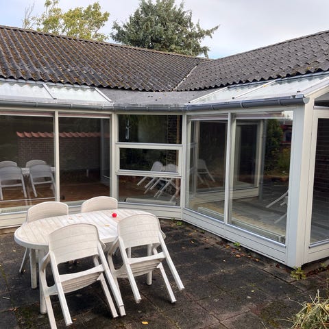 Udestue med glaspartier. Konstruktionen er lavet med store vinduespartier, der giver god lysindfald. Egnet til brug som ekstra opholdsrum eller spisestue med udsigt til haven.