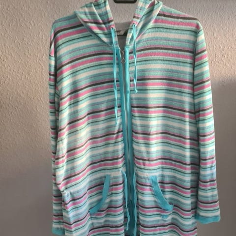 Change Silke morgenkåbe i størrelse L. Materialet er 100% silke, og ærmerne er med detaljer på ærmekanterne. Har aldrig været brugt, men har fået en plet/skjold på bæltet. Se billede. Kan måske fjernes med lidt ihærdighed.