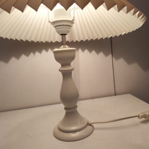 To bordlamper med hvide, foldede skærme og hvide gips baser. Lamperne har en klassisk design og er med elektrisk ledning til tilslutning. 50 cm i højden