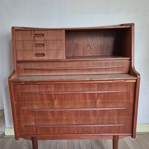 Dansk design. Sminkebord i teak med skuffer. Også skrivebordsindsats, der kan trækkes ud.