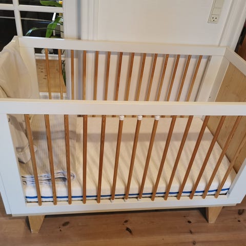 Tremmesengen er en udgået model fra Troll Nursery, der har en side der kan skiftes ud, så den kan bruges som junior seng, når barnet selv kan gå ind og ud af sengen.