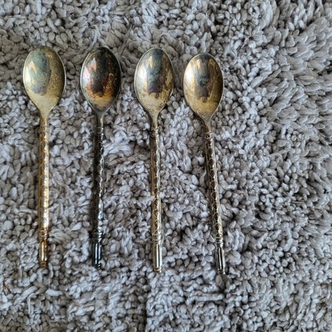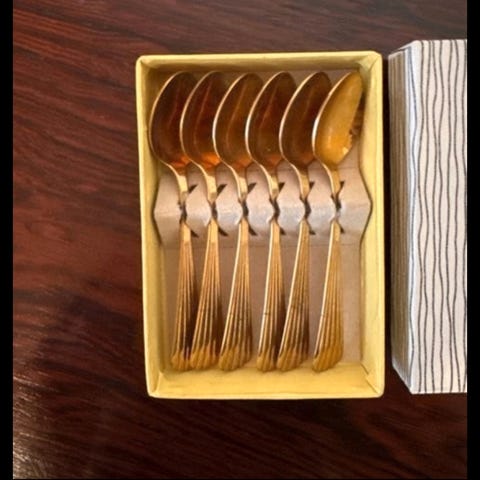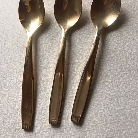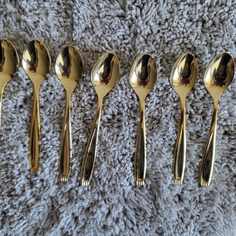 Guld Teske skeer i rustfrit stål. Sættet indeholder 9 guld skeer i forskellige størrelser, som kan bruges til forskellige formål som dessert, te eller kaffe.