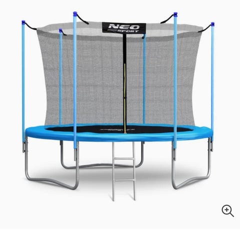 Havetrampolin 4,3 meter fra PE-resakaber. Komplet med presenning til at beskytte. Brugt med småskader ved fjedre, men fungerer perfekt. Der findes ikke sikkerhedsnet til denne type trampolin.