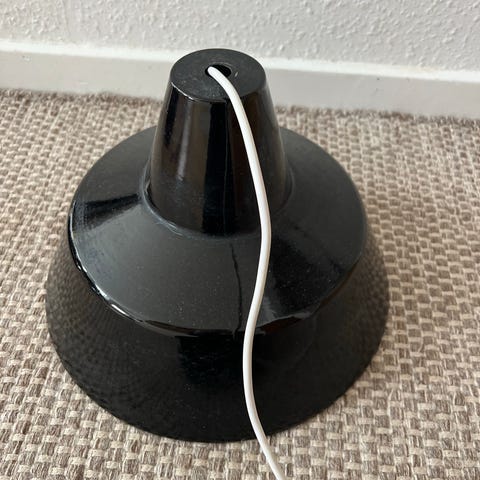 Koksgrå loftslampe med tilhørende 2,5 m ledning i samme farve. Lampen er hvid indvendig. 40 cm i diameter. Kan ikke huske original prisen, men nok ca 1500 kr.