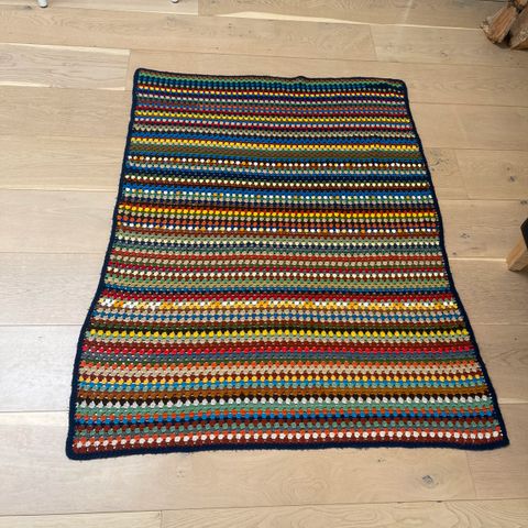 Tæppet er strikket i det blødeste 100% merino garn - "Extrafine merino 150 fra Hjertegarn". Strikket i dobbeltgarn. Hæklede kanter. Str. 82 cm x 95 cm.