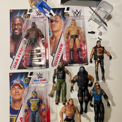 Sæt med 8 WWE actionfigurer i forskellige udgaver og påklædning. Figurerne varierer i størrelse og detaljer, og er designet til samling eller leg.