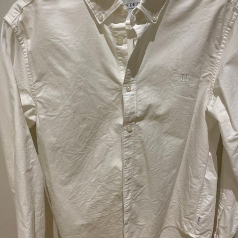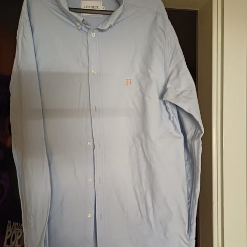 Les Deux Skjorte i størrelse M. Fremstillet i bomuld med blå stribet mønster. Designet til mænd.