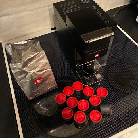 Illy espressomaskine i sort farve. Maskinen er designet til at brygge espresso og har en kompakt størrelse, der passer til de fleste køkkener.