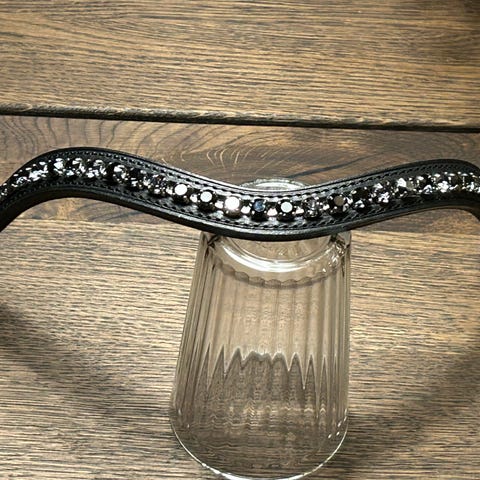Sort læder str. full med dråbeformede store glimtende sten som starter med sorte sten i siden og bliver klare fortil. Ny pris 1729,95