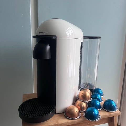 Nespresso Vertuo kaffemaskine i sort farve. Maskinen er designet til at brygge kaffe med Nespresso kapsler og har en kompakt størrelse. Den har en gennemsigtig vandbeholder og et brugervenligt drejehåndtag til kapselindsættelse. Velegnet til hjemmebrug.