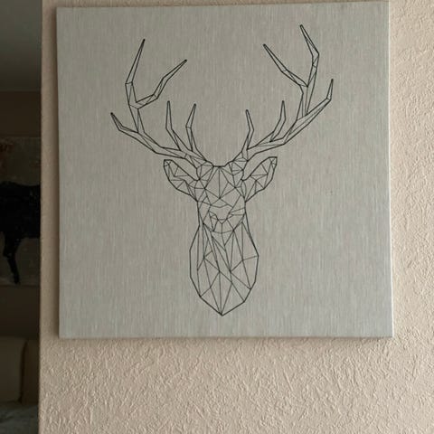 IKEA dekorationsbillede med motiv af en hjort med farverige og detaljerede gevirer. Billedet har en blanding af naturlige og kunstneriske elementer, der skaber et unikt udtryk. Velegnet til vægdekoration i hjemmet.