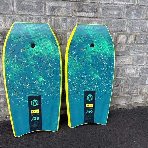 Sæt bestående af 3 bodyboards med forskellige motiver: en med solnedgang og tekst, en med palmetræer og en med hajmotiv. Bodyboardsne er designet til vandsport og leg i vandet.