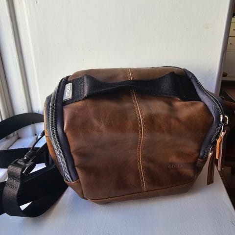 Leica sort kamerataske i læder med justerbar skulderrem. Tasken har flere rum til opbevaring af kameraudstyr og tilbehør.