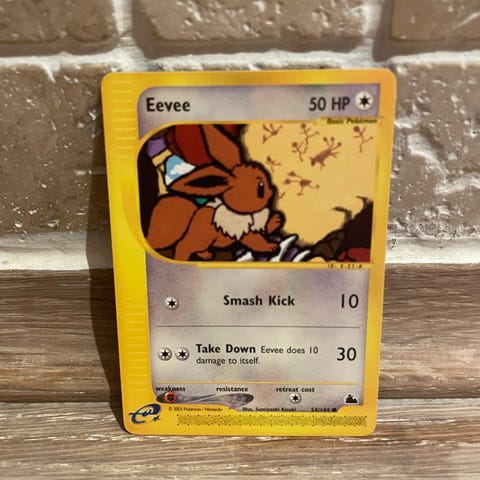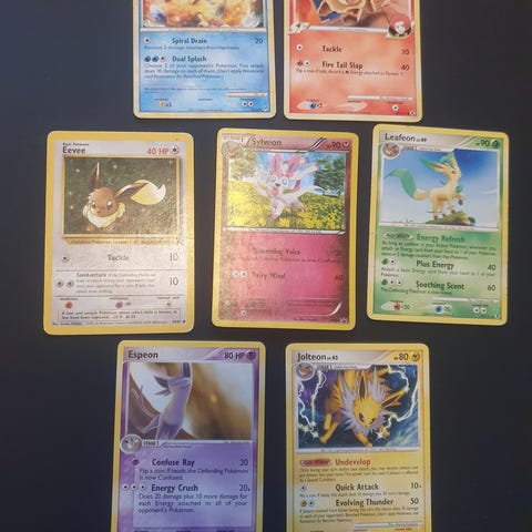 Pokémon Eevee Lucario samlekort med holografisk design. Kortet viser karakteren Eevee Lucario og indeholder spilrelaterede oplysninger. Kortet er velegnet til samling eller spil.