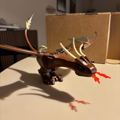 Der mangler klistermærke til dragens øjne (kan evt males på) og den mørkegrå trekantede legoklods skulle have været i lysegrå (den har vi desværre mistet). Se billederne.