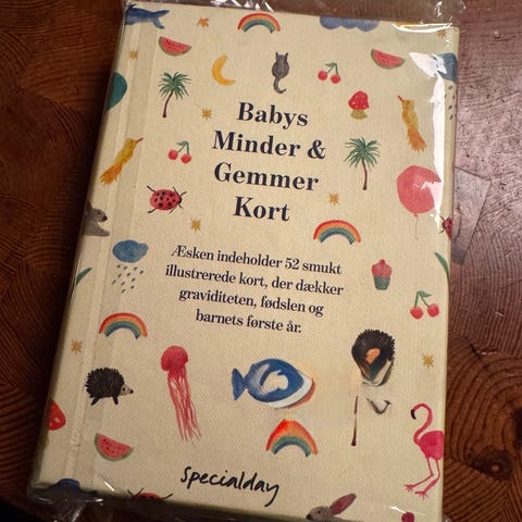Æske med 38 erindringskort for babys første år.