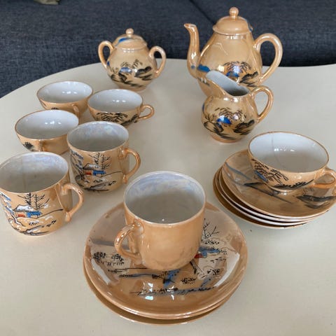 Testel "Gråsten" fra Løvemose Keramik. Alt er intakt. Ingen skår og håndtag i bambus/rattan er flotte.