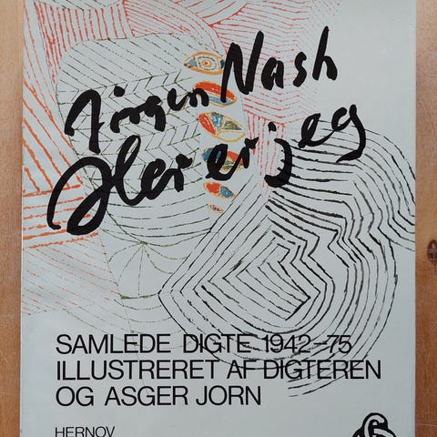 Her er jeg, Jørgen Nash, genre: digte, Jørgen Nash. Her er jeg. Samlede digte 1942 – 75. Illustreret af digteren og Asger Jorn. Udgivet på Hernov 01.01.1975. 1. oplag.