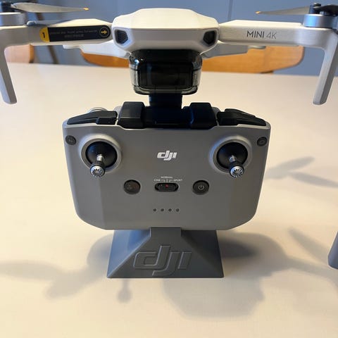 DJI Mini drone leveres med et opbevaringsetui og tilbehør inklusive fjernbetjening og batterioplader med plads til tre batterier. Dronen er grå og kompakt, designet til nem transport og brug.
