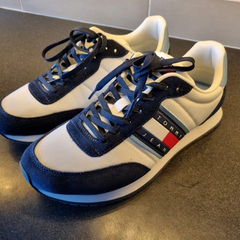 Tommy Jeans sneakers i størrelse 43. Skoene er hvide med blå og sorte detaljer. Designet til generel brug inden for sportstype 'Andet'. Normal pris :1200kr helt nyt
